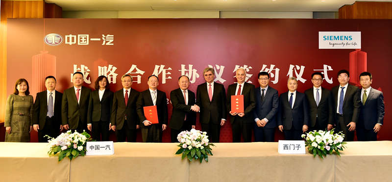 西門子與中國第一汽車集團有限公司(以下簡稱“中國一汽”)今天在京簽署戰略合作協議,雙方將共同攜手合作打造紅旗品牌先進的數字化工廠,打通其汽車業務價值鏈,樹立中德合作數字化工廠的典范。西門子股份公司總裁兼首席執行官凱颯(Joe Kaeser)和中國一汽董事、總經理、黨委副書記奚國華共同見證了合作協議的簽署。